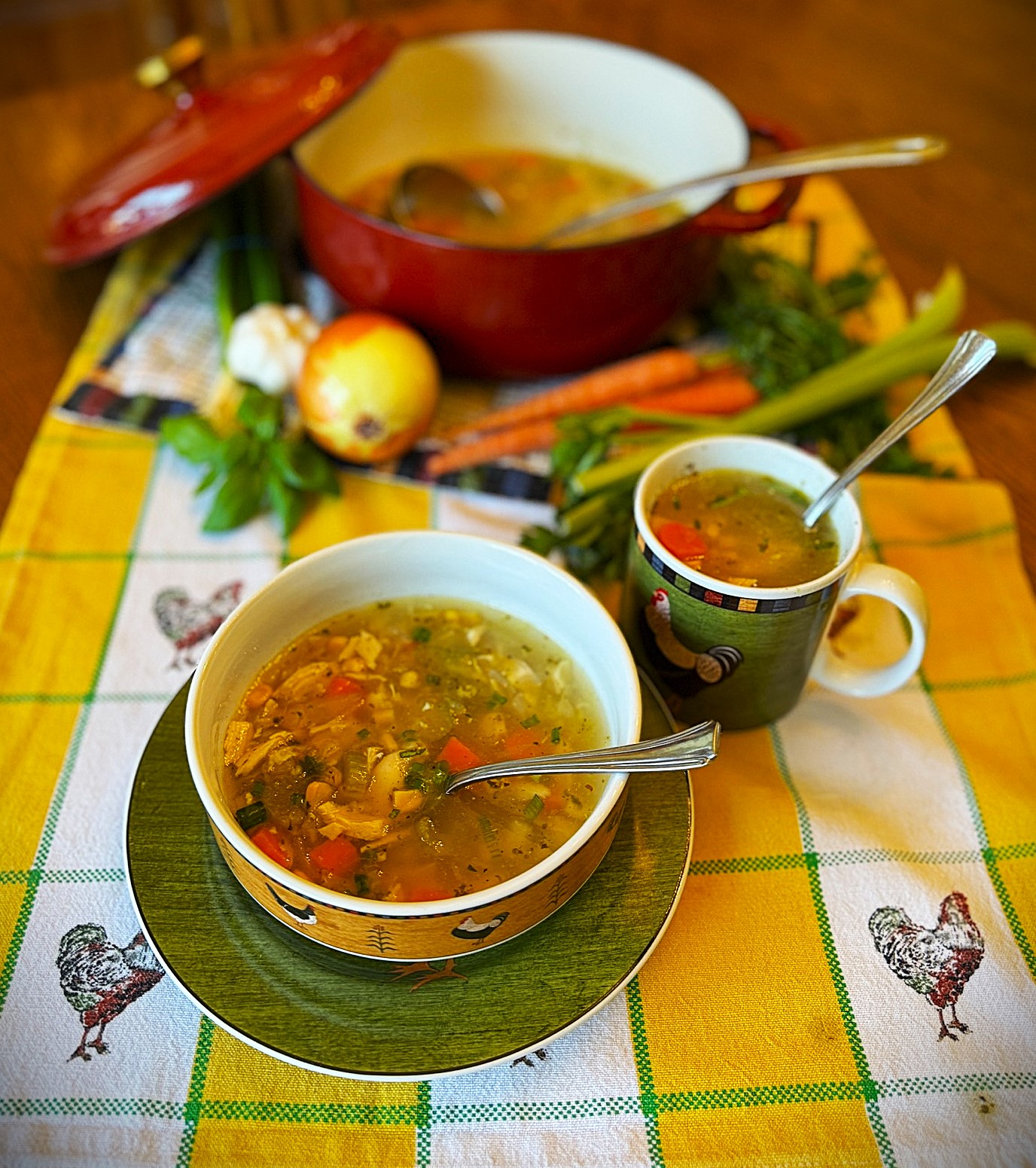 This post isn’t as much a recipe as a process. The beauty of soup is that it can be made from whatever you have on hand. That’s what I did a month ago, when I had friends over for a holiday gathering. I was running behind and threw together a chicken veggie soup in about 15 minutes. I had so many compliments on my quickie soup that I realized it would make the perfect Daytime TV segment.