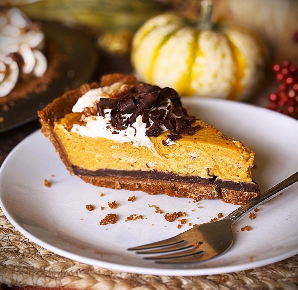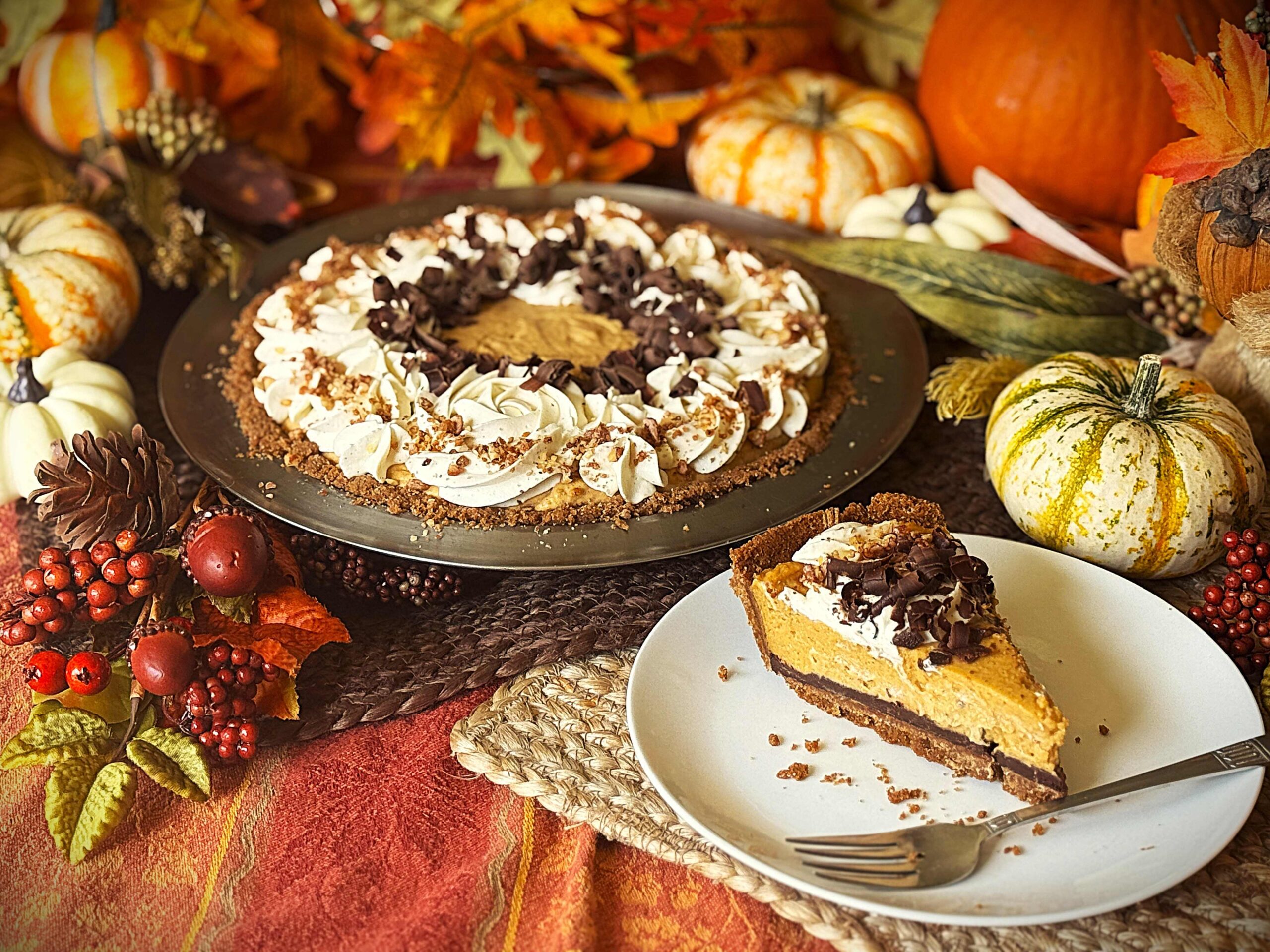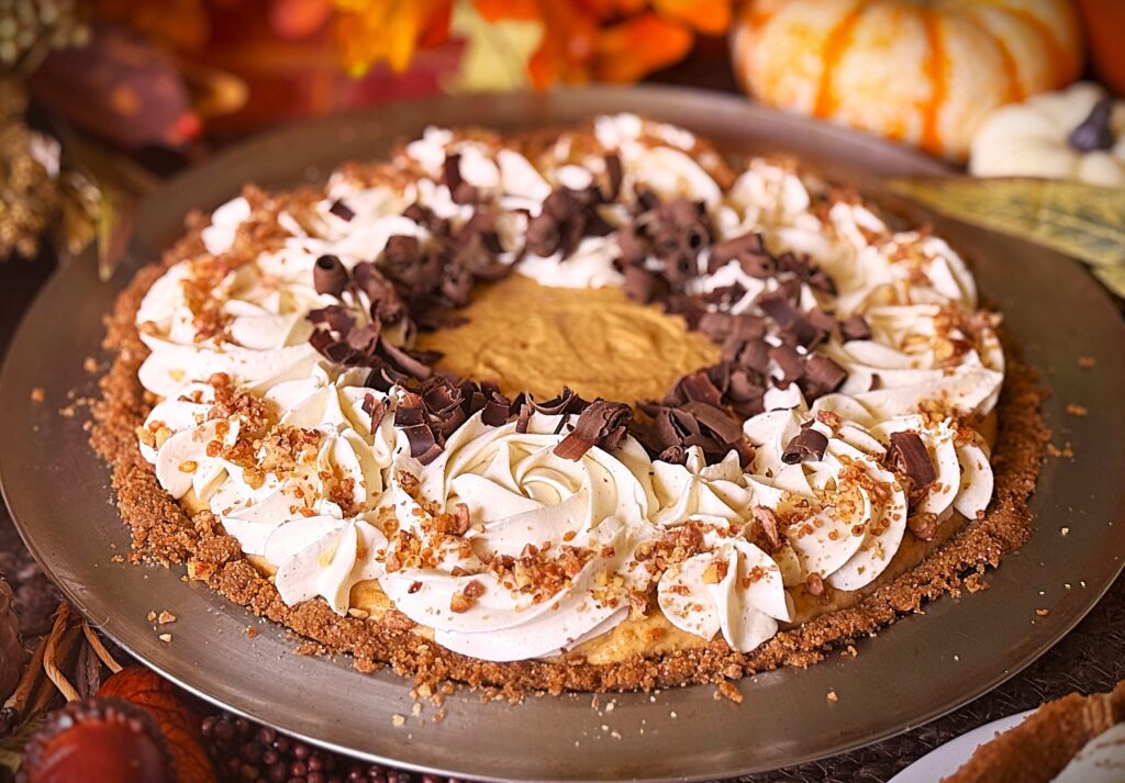 Whip the pastry cream briefly with a mixer to make it creamy again after it has set up. Add 1 cup of canned pumpkin puree and 2 teaspoons of pumpkin pie spice. Once combined well, add in 1 full cup (or more if you like) of the mascarpone whipped cream and stir well. Place the filling in the ganache-lined cookie crumb pie crust and spread evenly. Either now or after chilling, decorate as desired by piping more of the mascarpone whipped cream and sprinkling with crushed candied nuts, chocolate shavings, extra cookie crumbs, caramel drizzle, or whatever else you like. Keep the pie cold until ready to serve.