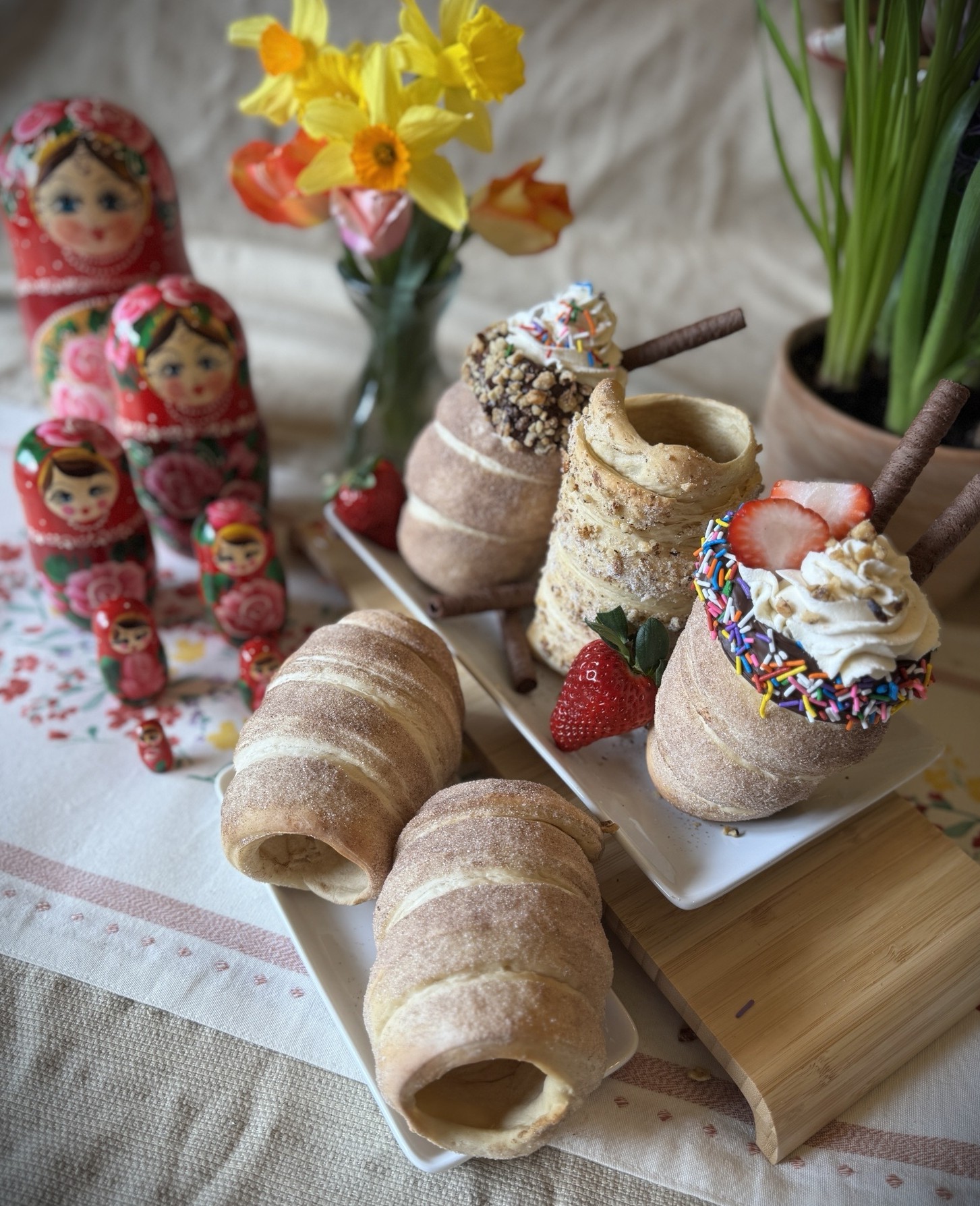 At the time, I couldn’t imagine making them at home, as I didn’t have the special equipment the shops had. But once I returned, a quick internet search showed me numerous recipes that could be made in a normal kitchen, using aluminum foil-covered soda cans or rolling pins to do the baking. Csodálatos! (That means “wonderful” in Hungarian.)
