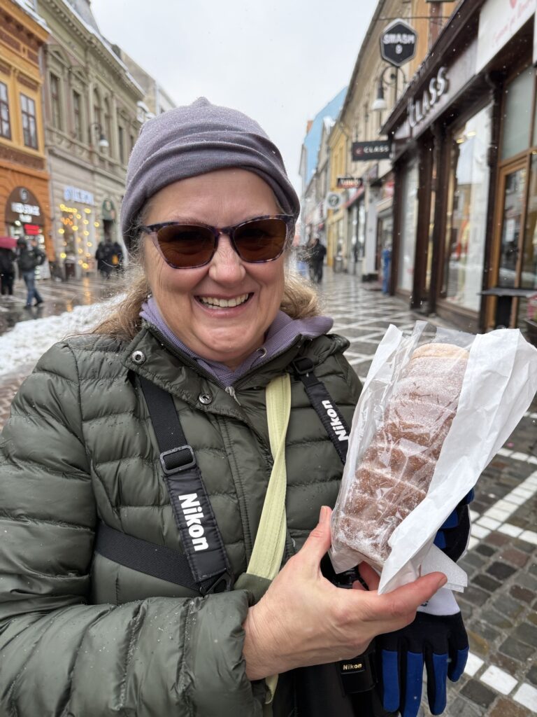 Our Romanian friends live in Transylvania, which most Americans associate with Dracula. When we toured Bran Castle, Dracula wasn’t to be seen, but the views were spectacular. The next day we walked the streets of Brosnov and there I had my first ever Chimney Cake. It was not to be my last.